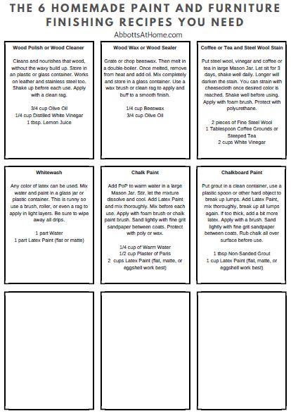 6 Great Homemade Wood Finishing Recipes; including DIY Wood Cleaner, Wood Stain, Whitewash, Chalk Paint, Furniture Wax, & Chalkboard Paint.