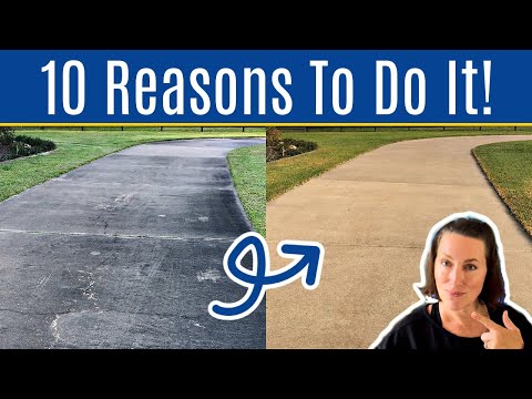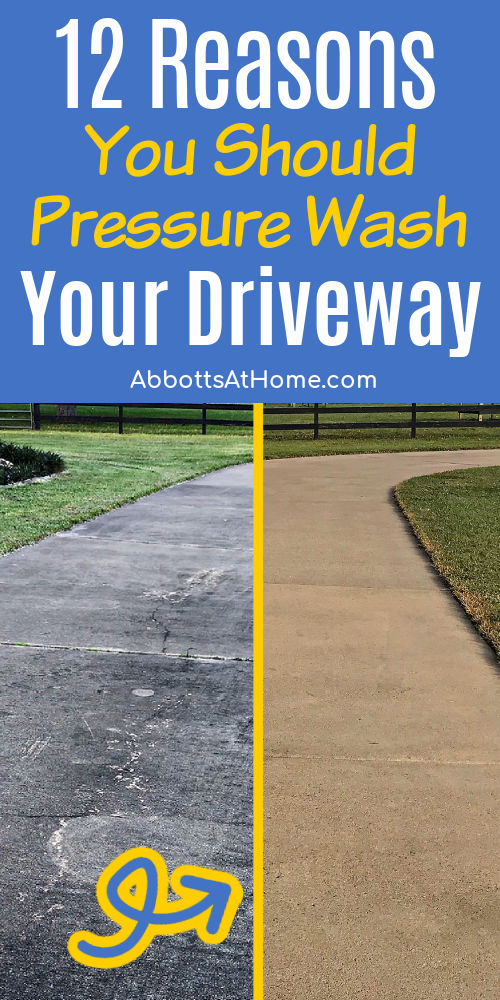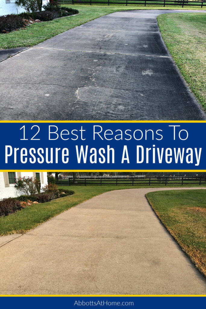 Image shows before and after on a really dirty driveway. Text says "12 reasons you should pressure wash your driveway"