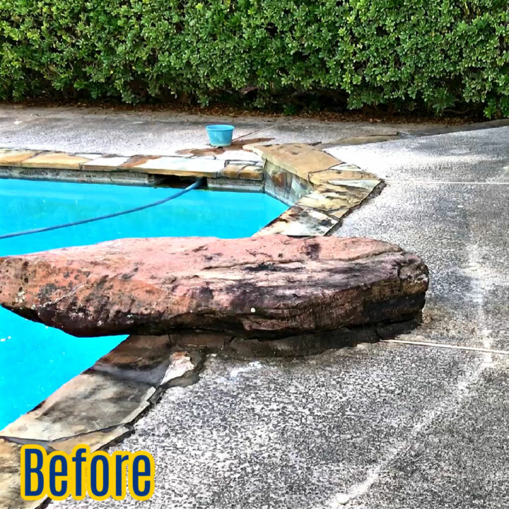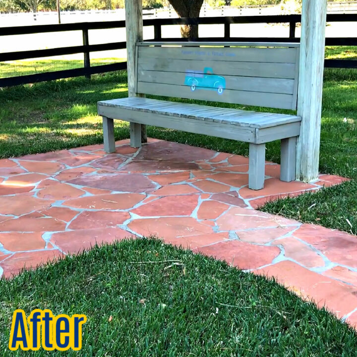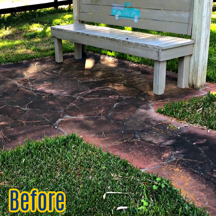 This stone walkway in our backyard was pretty black from dirt, mold, and mildew growth. This stone floods about once a year during strong rains or hurricanes.