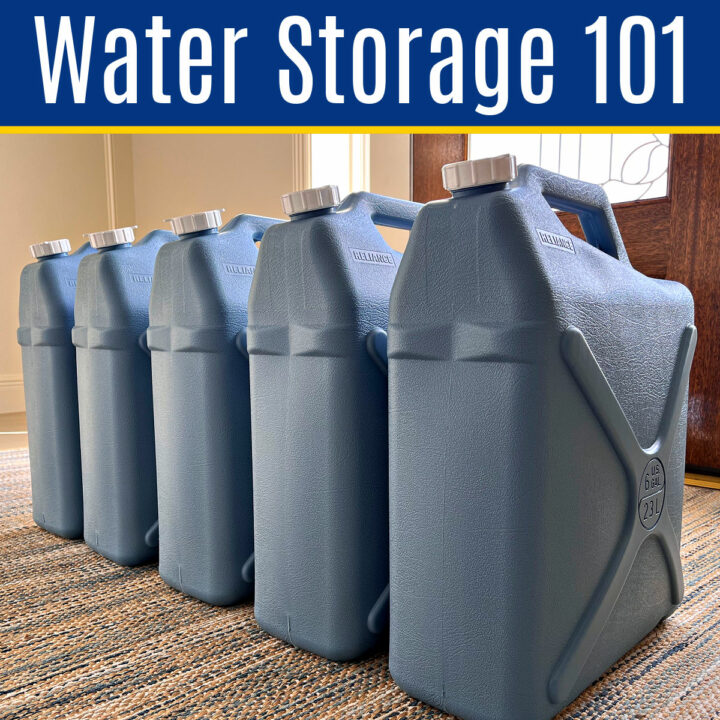 Image of 6 Gallon Water Storage containers with text that says 'Water Storage 101' for a post about how to store water for emergency.