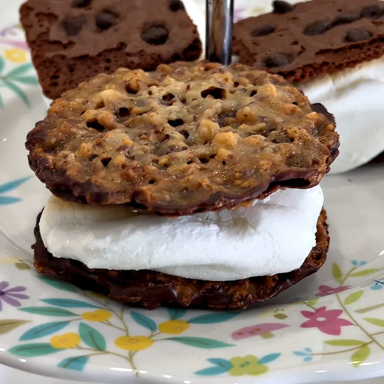 This unique Smores idea is AMAZINGLY good. Just sandwich a toasted marshmallow between 2 almond chocolate Lacy cookies and enjoy!