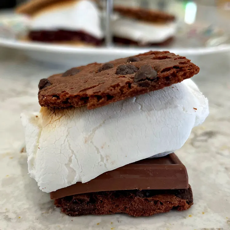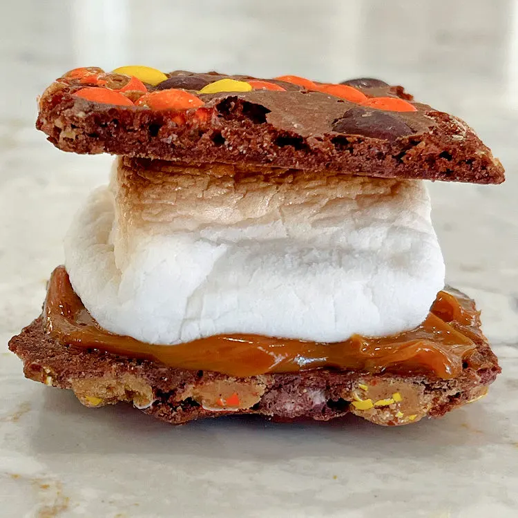 This yummy S’mores variation is made with Reese’s Pieces Brownie Brittle, peanut butter, and a jumbo marshmallow roasted in the oven.