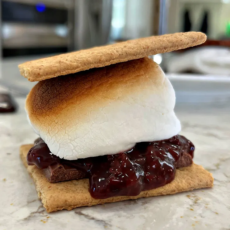Pop some cherry pie filling onto the Hershey’s Bar with marshmallow and Graham Crackers to make Smores At Home that tastes like chocolate covered cherries.