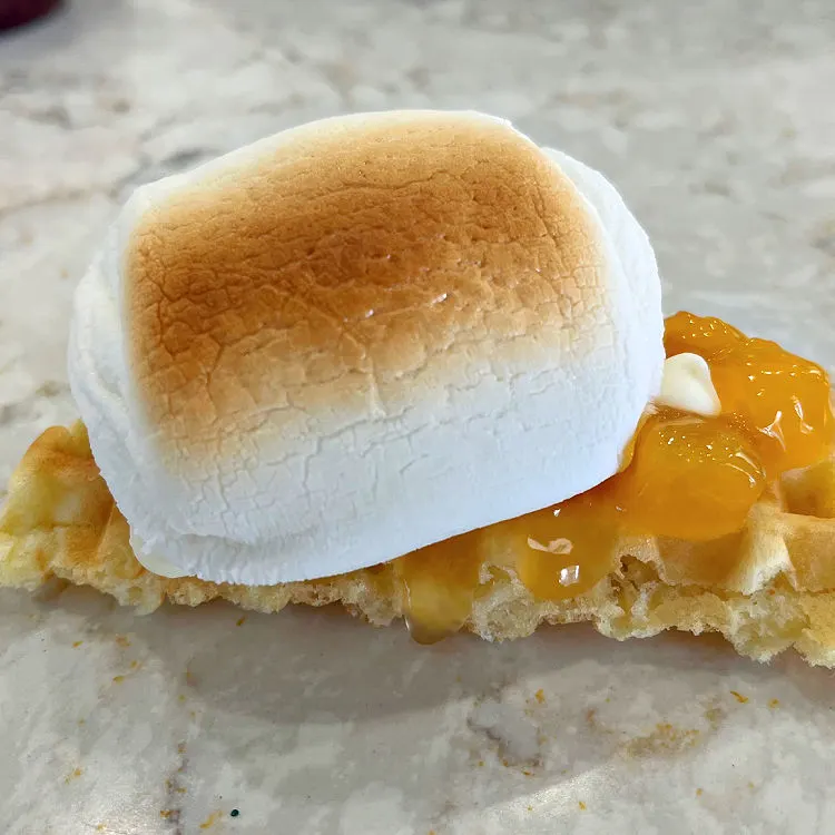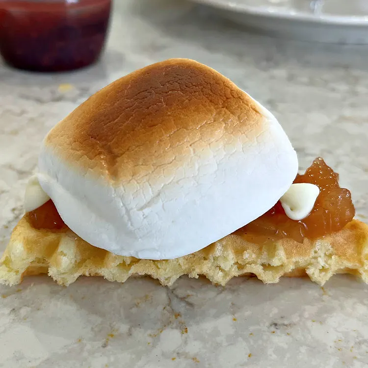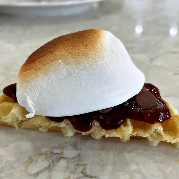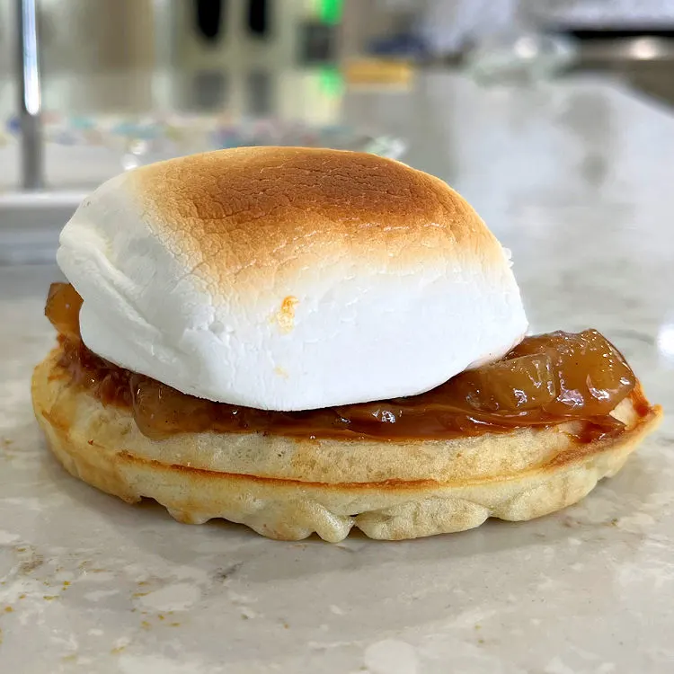 Apple Pie filling is SO GOOD on this toasted waffle half, topped with white chocolate chips and a jumbo roasted marshmallow.