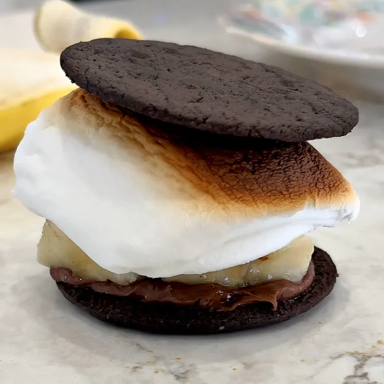 This is a personal favorite Smores combo. I love the crunchy chocolate wafers, hazelnut spread, and fresh banana mixed with oven toasted marshmallow.