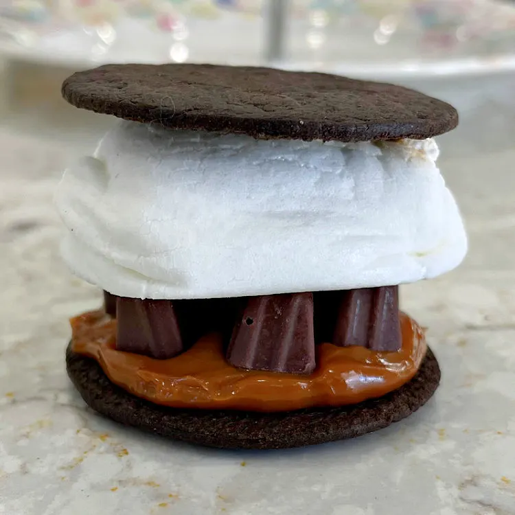 Crunchy chocolate cookies topped with a thick layer of Dulce De Leche, Chocolate Dulce De Leche truffles, and a jumbo toasted marshmallow makes a tasty Smores for chocolate and caramel combo lovers!