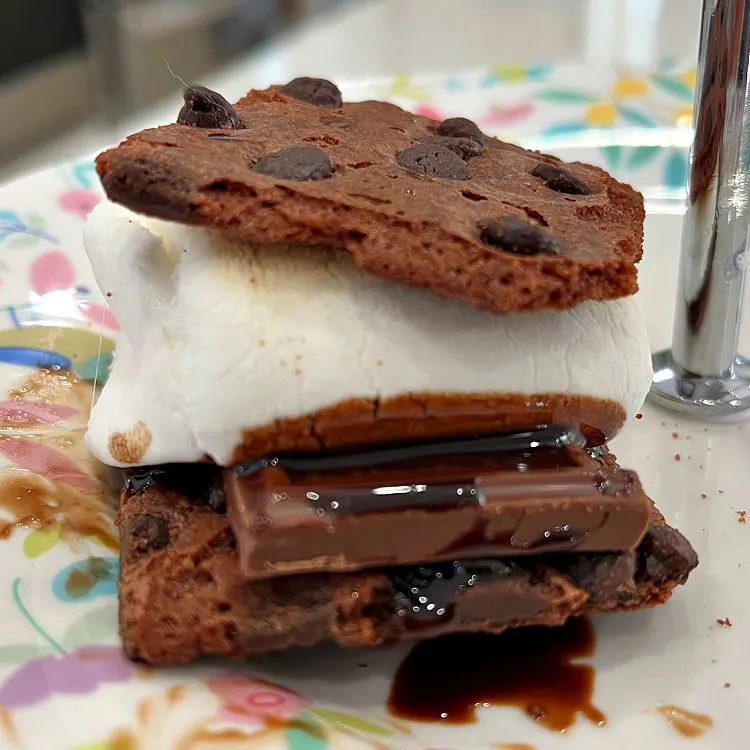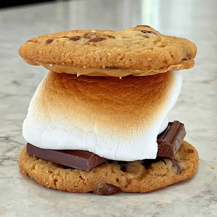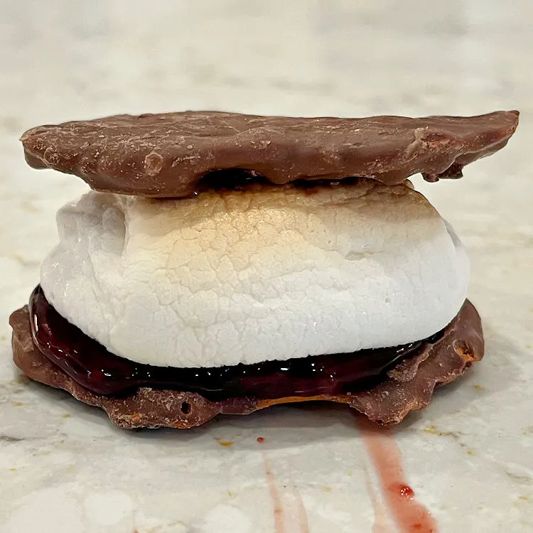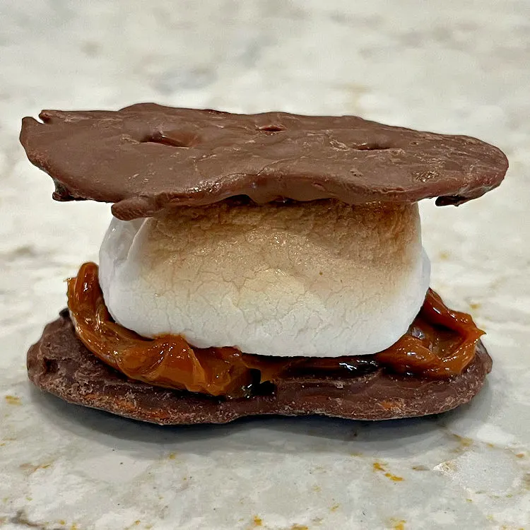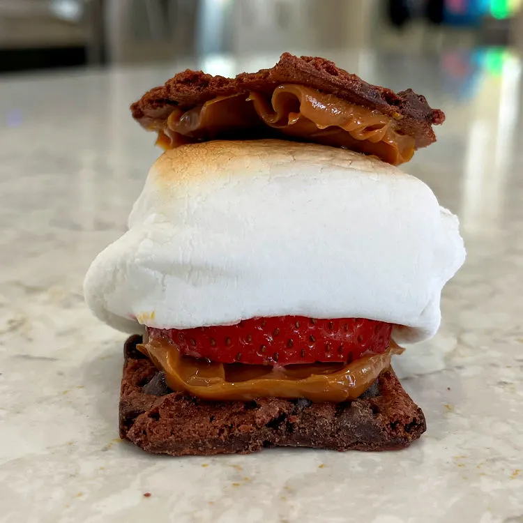 This crunchy vanilla waffle cookie makes the most delicious Smores when topped with a thick layer of Dulce De Leche, Chocolate Dulce De Leche truffles, and a jumbo roasted marshmallow.