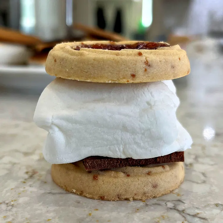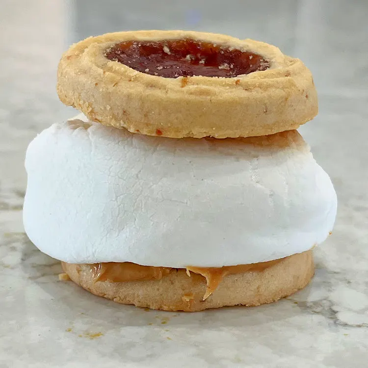 I used Strawberry Thumbprint cookies, Hershey’s chocolate bar and marshmallow to make this tasty Smores. But, any flavor jam thumbprint cookie would be great!
