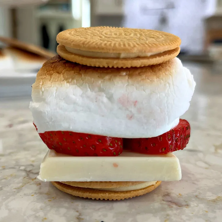 Here’s a SUPER YUMMY white chocolate, fresh strawberry, and marshmallow Smores on Lemon Thins Oreos.