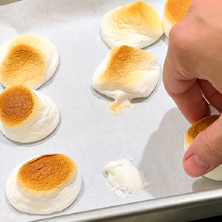 Then let them cool for a couple minutes before lightly twisting and pulling the oven roasted marshmallows from the baking sheet.