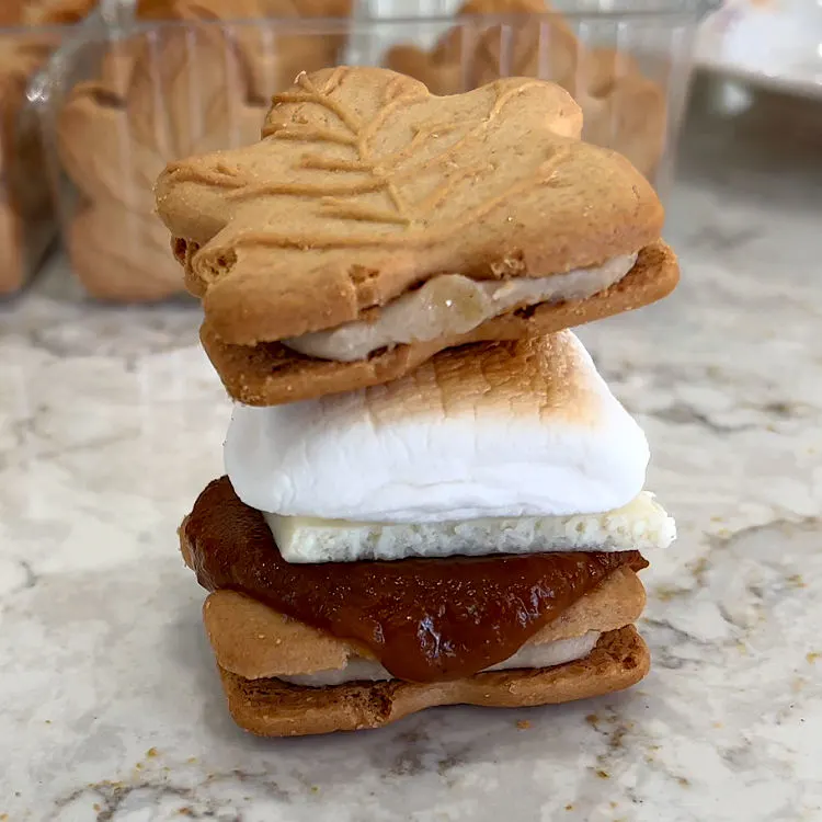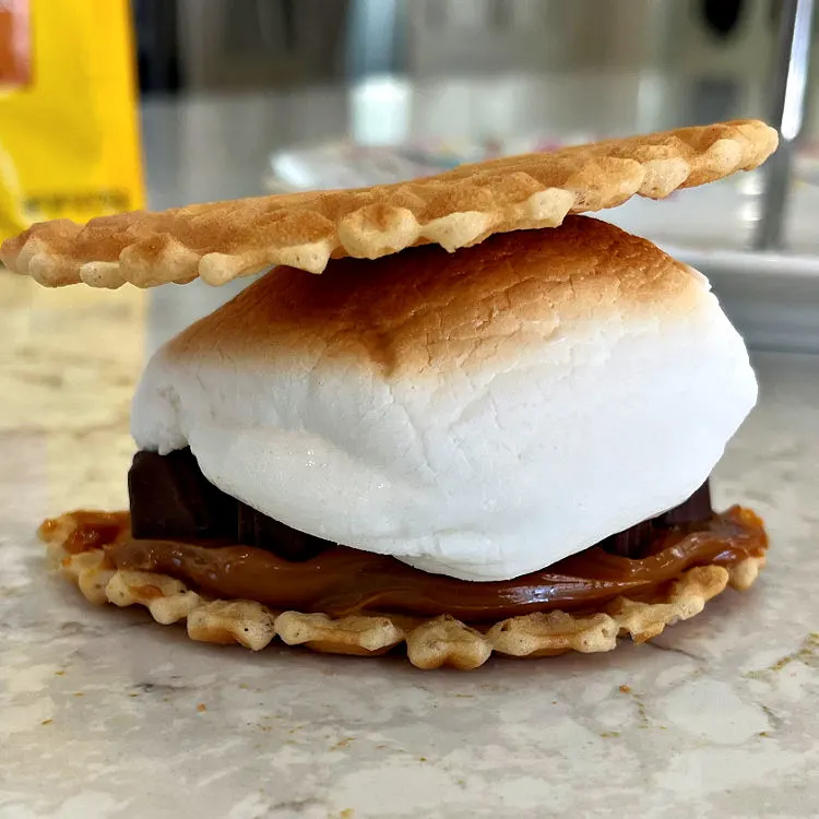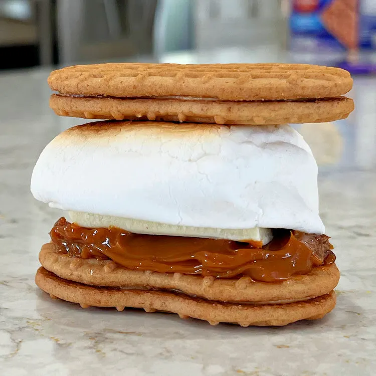 A thick layer of Dulce De Leche on this waffle cookie Smores tastes great with apple pie filling and a toasted marshmallow.