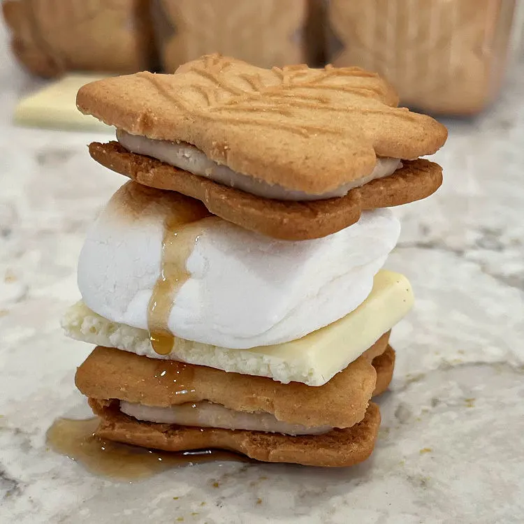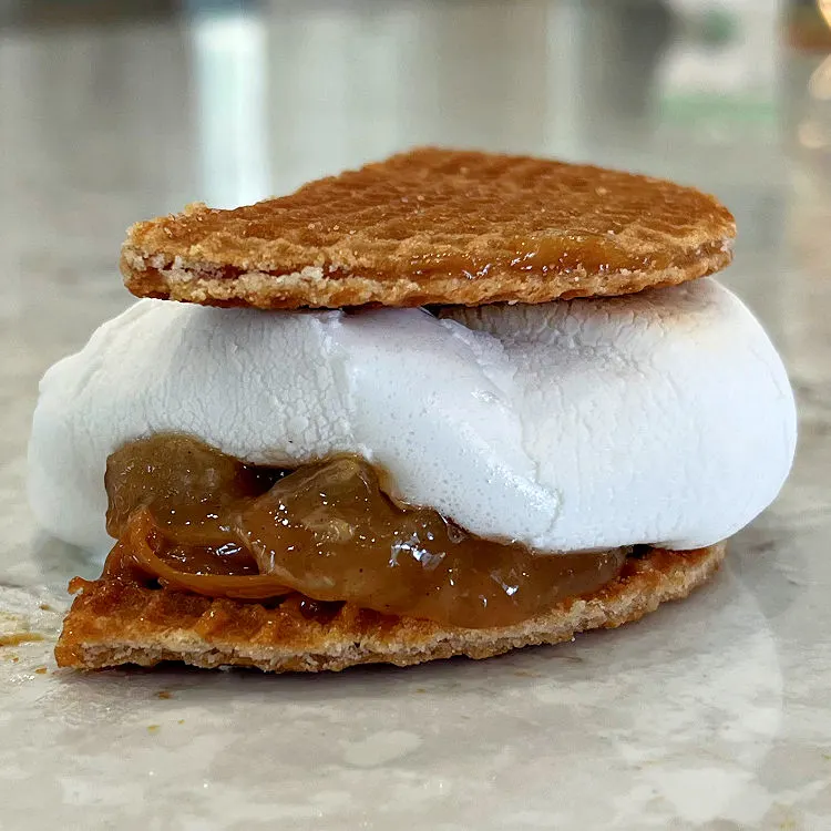 Cut a caramelly Stroopwafel cookie in half to build this yummy Smores with Dulce De Leche, Apple Pie Filling, and a toasted, gooey marshmallow.