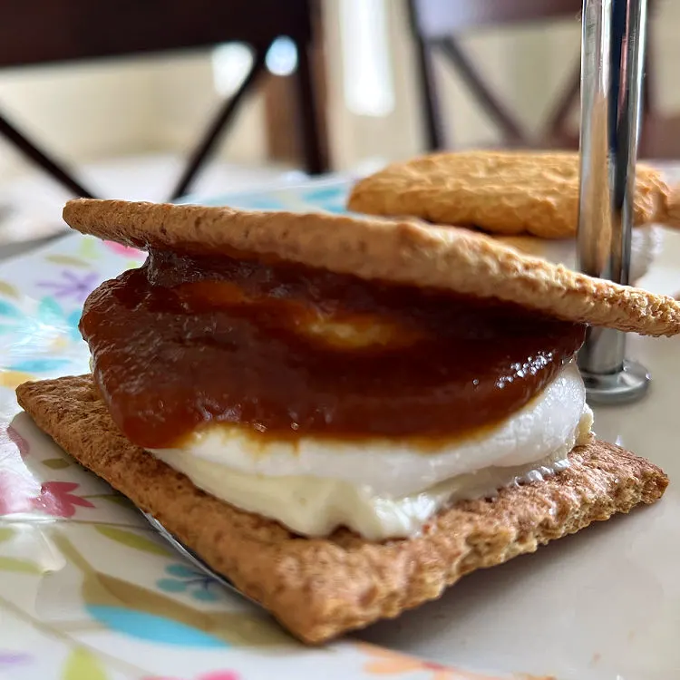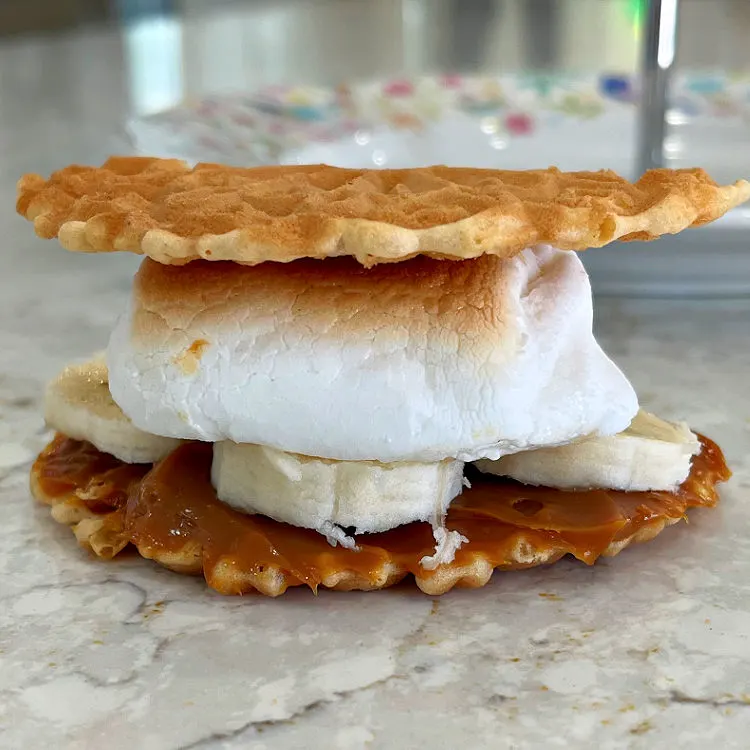 If you’re British, this Smores will remind you of Banoffee Pie. It’s a yummy Smores made with a thick layer of Dulce De Leche, bananas, and a roasted marshmallow on a Vanilla waffle cookie.