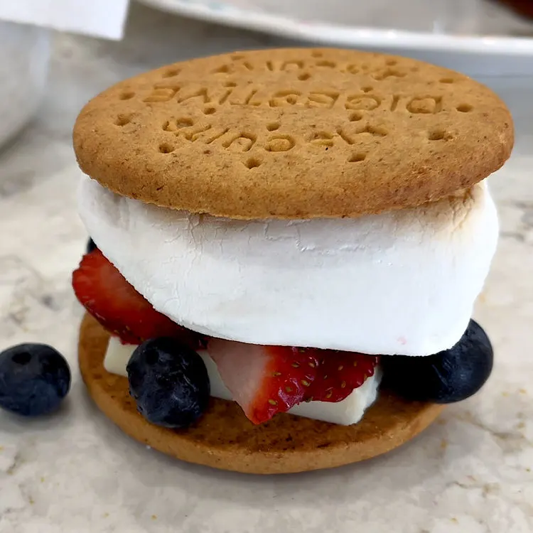 This tasty Smores has fresh berries, white chocolate, marshmallow, and Digestives cookies, which are basically the British version of a Graham Cracker.