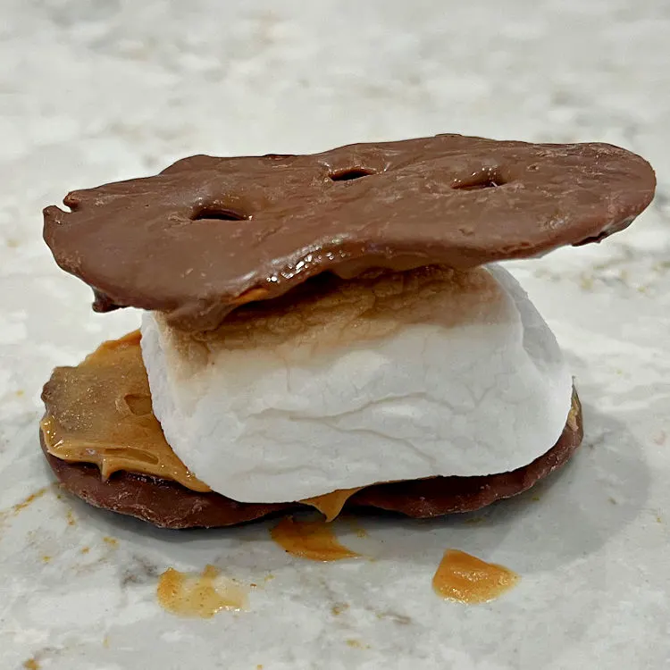 Spread your favorite Peanut Butter on Chocolate Pretzel, then add a marshmallow to make this chocolatey peanut butter Smores at home.