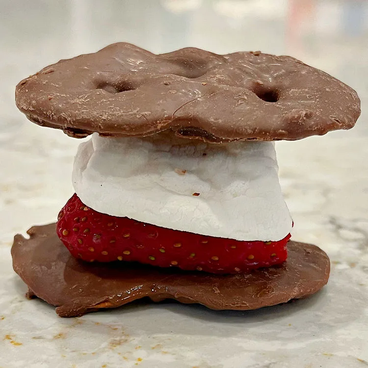 Thin, chocolate covered pretzel Smores with fresh strawberries and marshmallow. This one is salty, sweet, and crunchy.
