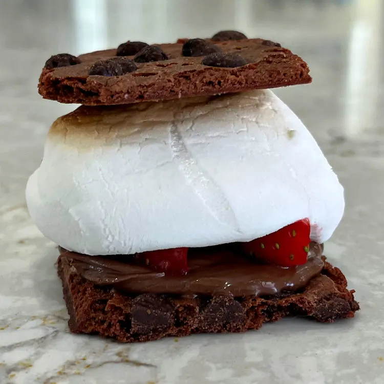Have you tried Brownie Brittle??? It’s so good and crunchy. This delicious Smores is made with Nutella hazelnut spread, strawberries, and marshmallow.