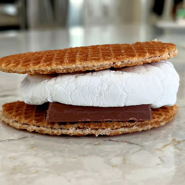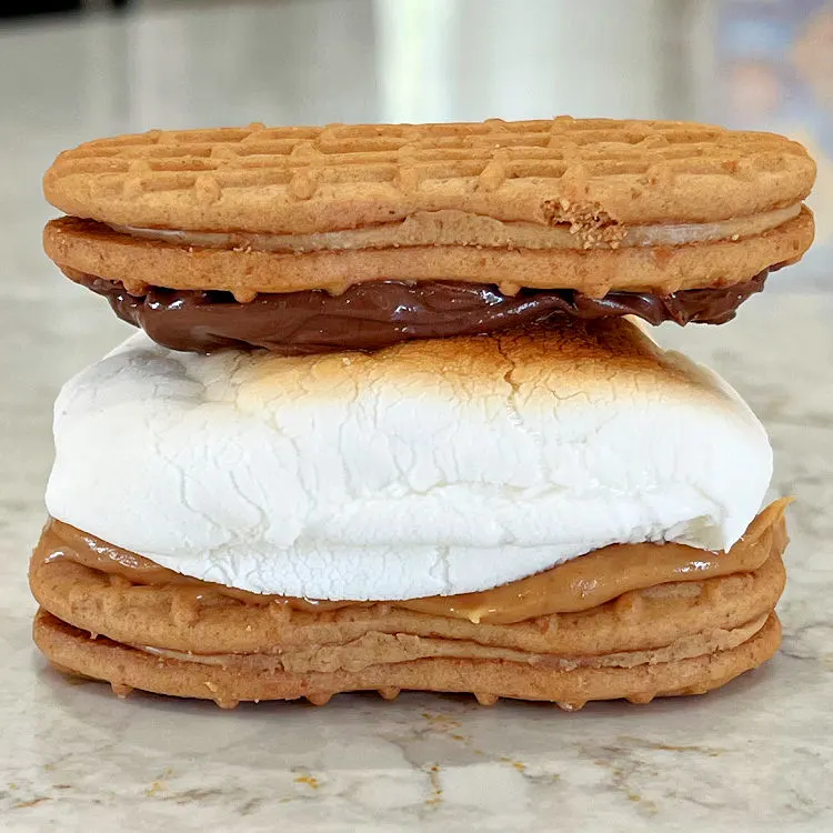 Sandwich a Ghirardelli Caramel Square and a toasted marshmallow between 2 halves of a caramel-filled Stroopwafel to make this Caramel Lovers Smores.