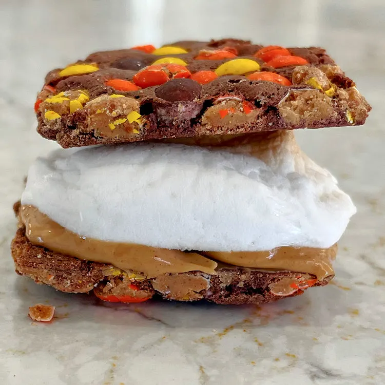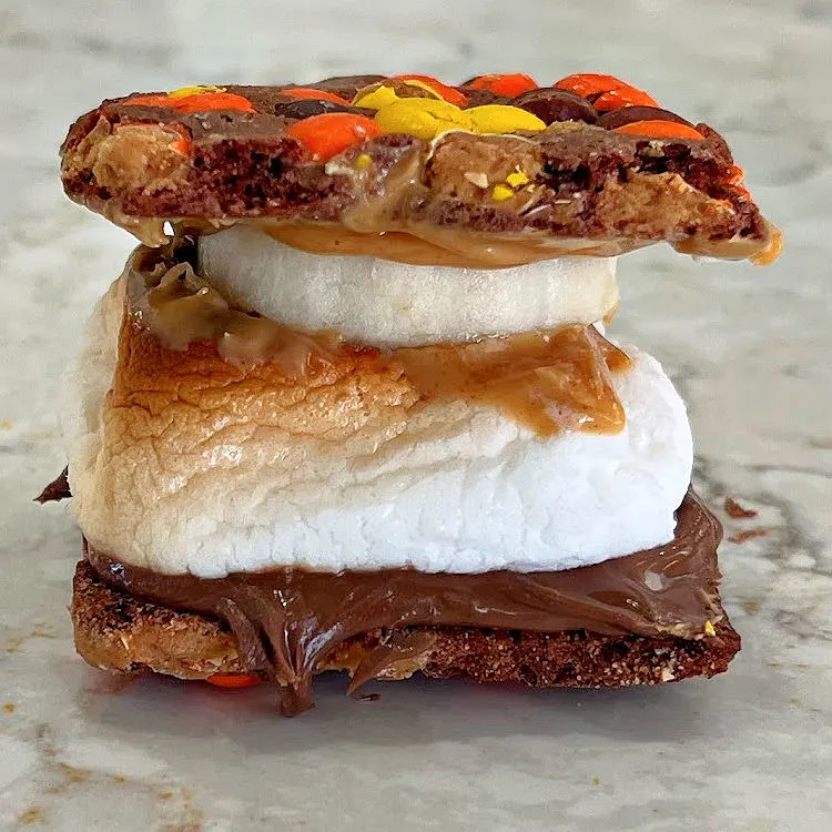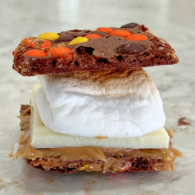 Make Smore’s at home with tasty Reese’s Pieces Brownie Brittle, Peanut Butter, White Chocolate, and oven roasted marshmallow.
