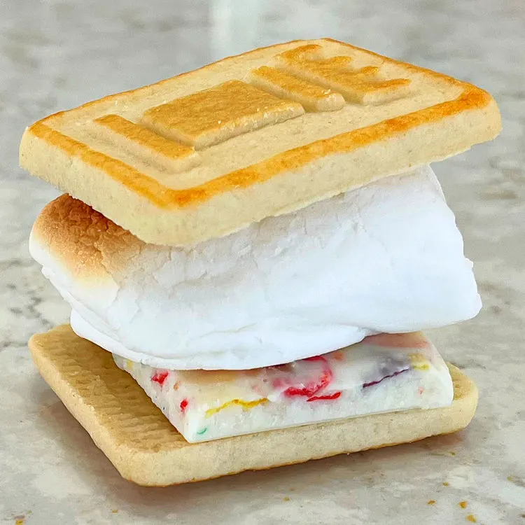 Use Shortbread Cookies and a piece of a Birthday Cake candy bar with a toasted marshmallow to make this colorful Smores.