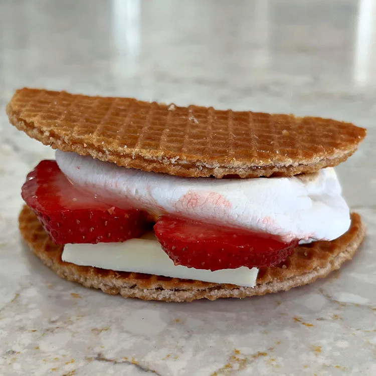 This yummy and quick dessert is made with Stroopwafels, white chocolate, marshmallow and fresh strawberries.