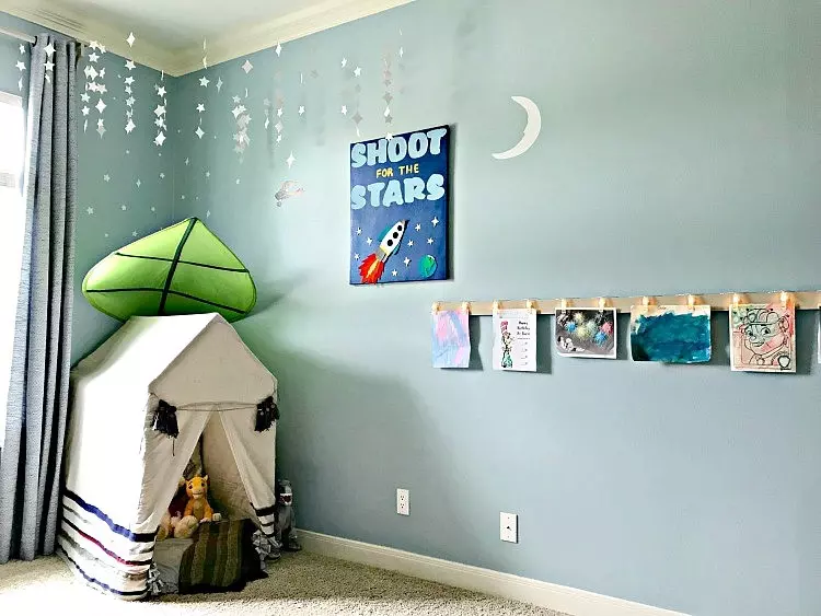 I also went for a full DIY Outer Space Bedroom Wall Idea that is basically just blue wall paint with vinyl stickers on top. Easy!