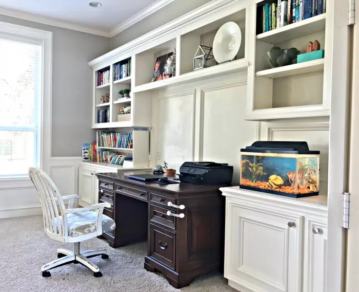 Alright, let’s move on to our home office makeover. In this room I wanted to extend those built ins to add more storage. I also really wanted those cabinets to look like built in furniture.