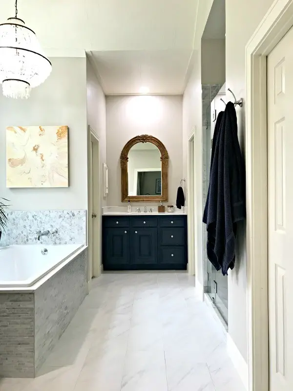 I went with a huge chandelier over the new extra big soaking tub, faux shiplap planks on the ceiling, light walls and marble tile. And, I also used a dark blue chalk paint and dark wax on the vanities.