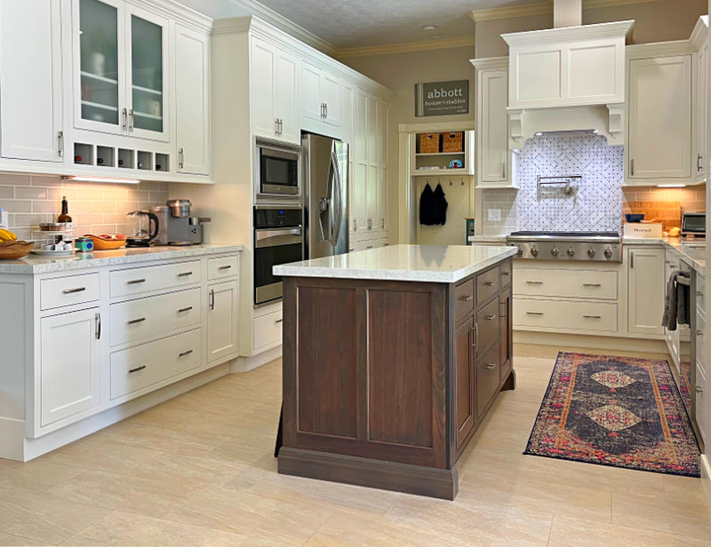 We completely gutted this kitchen; installing new cabinets, new flooring, quartz counters, a larger back door, larger island, and modern appliances. I also had the light fixtures changed.