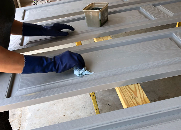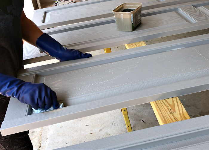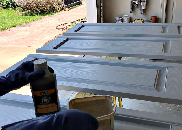 Be sure to not damage the shutters by pressing too hard. After scrubbing everything off with soapy water. Rinse the shutters, let dry, and apply the TSP to degrease the surface.