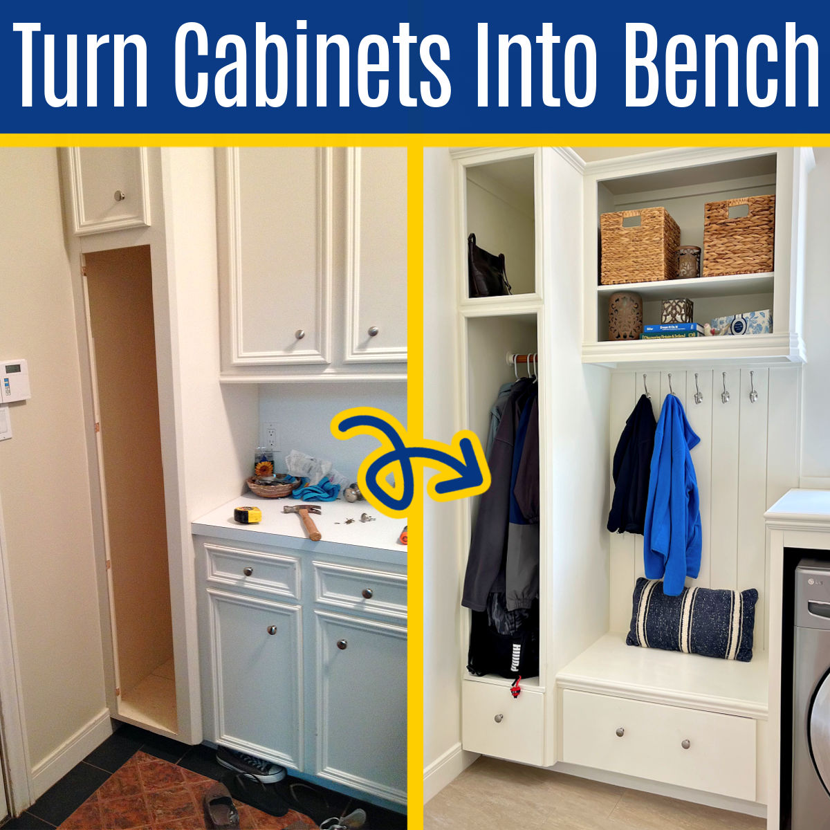 How I Added a Mudroom in a Small Laundry Room with cheap DIY projects and ideas that turned cabinets into a bench, shoe and coat storage.