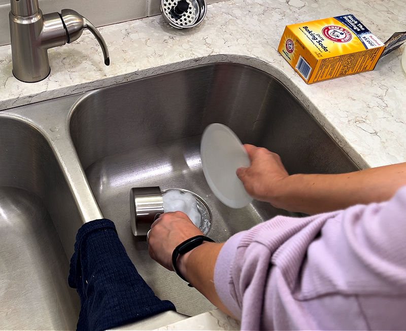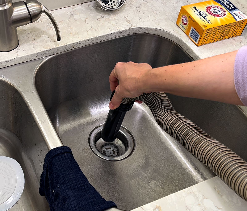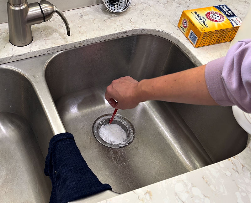 Using baking soda to clear a clogged kitchen sink drain.