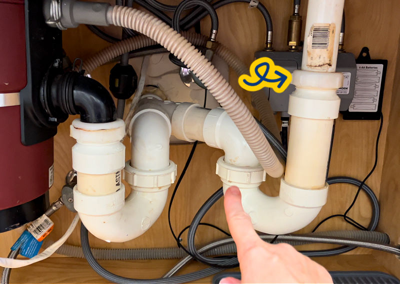 My kitchen sink has 2 p-traps (one for each sink). There are 2 nuts that connect the p-trap. I’m pointing at 1 of the nuts. An arrow points at the other.