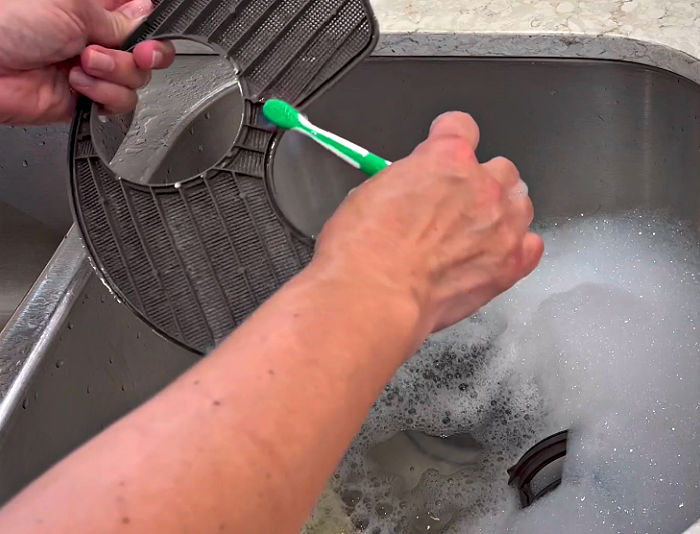 Using an old tooth brush to scrub my dirty dishwasher filter.