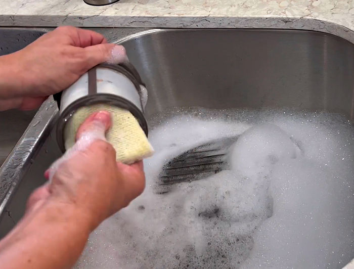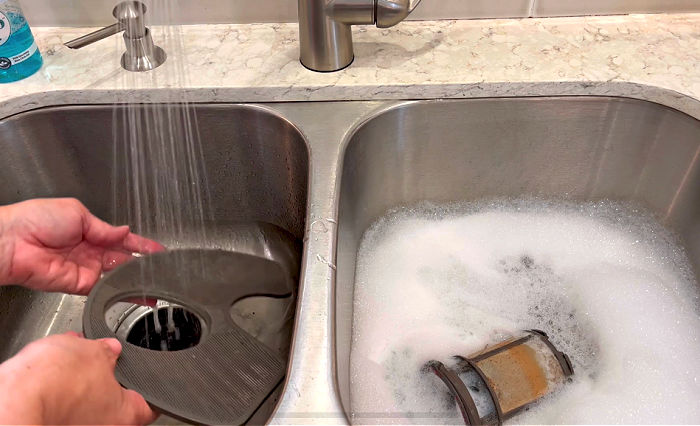 4. Once you’ve wiped away as much as possible, wash the filters in a sink of hot water and dish soap to remove the rest of the residue on the filters. I use old, soft tooth brushes and scrubbing sponges to get my dishwasher filters clean.