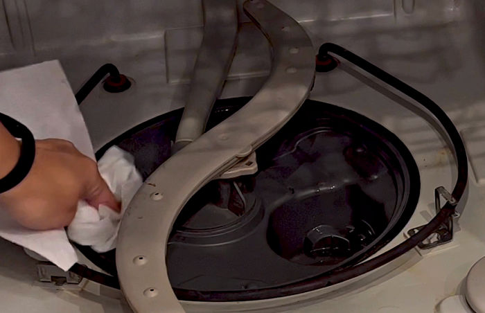 3. Once the visible mildew and stains are gone, remove the dishwasher filter(s). Wipe away all goop, mildew, soap scum, and food residue with dry paper towels.