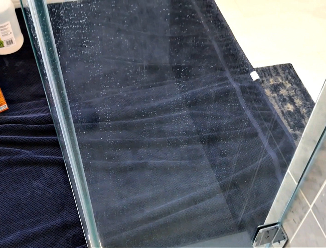 Here’s a look at the vinegar on my glass shower door. It’s wet enough to start breaking down all of that hard water. But, not so wet that it will run or drip on the marble tile.
