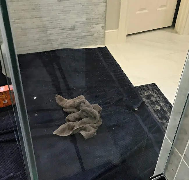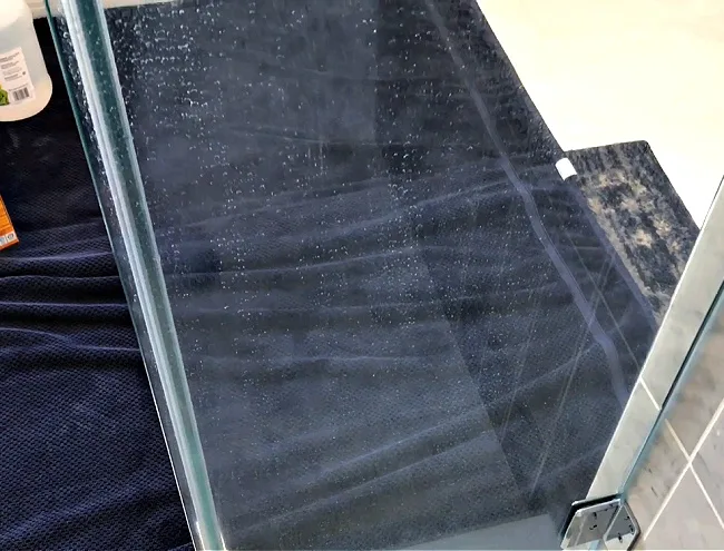 If you have stone, concrete, or marble tile, start by putting old towels down over the tiles under the shower glass. Vinegar can etch and stain these types of tiles.