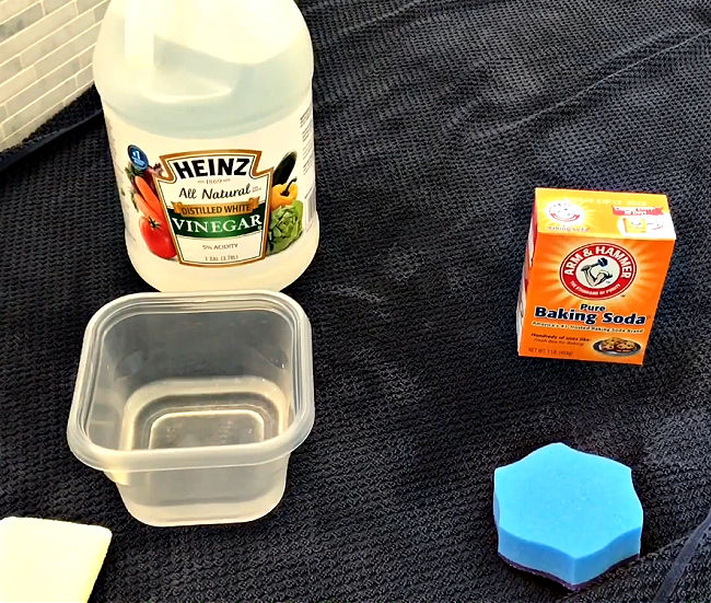 So, I use the vinegar first to breakdown and weaken those hard water stains. Then I follow it up with a baking soda scrub to remove any leftover spots.