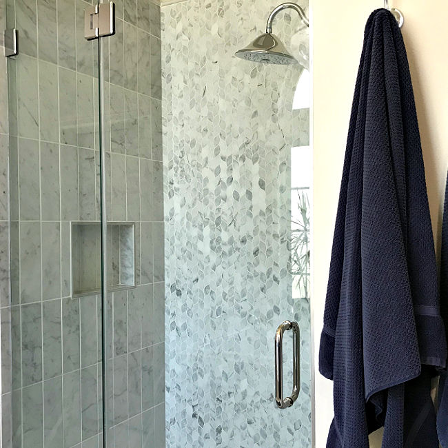 Here’s my clean glass shower door looking as great as it did the day it was installed. You can find my tips for framing in a shower niche, installing mosaic tile, and how to whiten tile grout in previous posts.