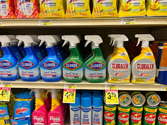 Chlorine bleach is a corrosive solution that can eat away at the finish on painted and stained cabinets. After just one use, it can dull the clear coat and lighten the color of the paint of stain on your cabinets.