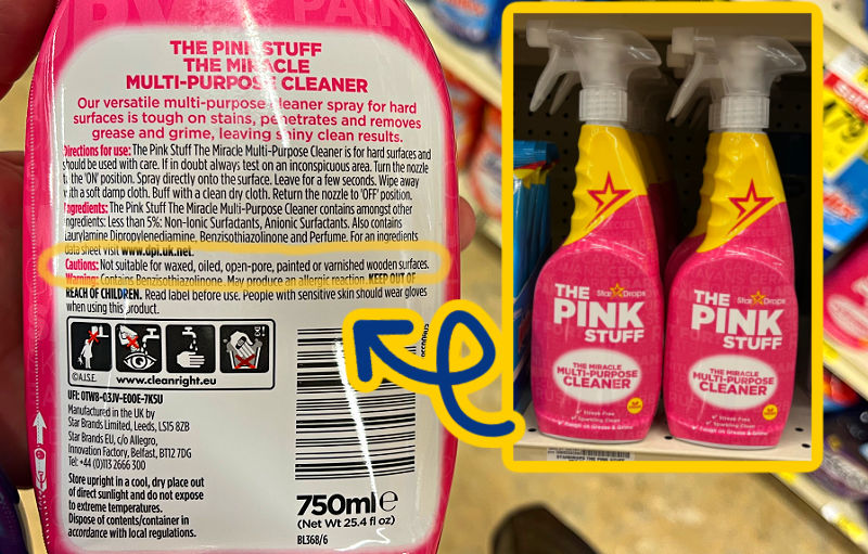 The Pink Stuff is a super popular cleaner. BUT, it can’t be used on everything. It specifically says on the back that it should not be used on painted or varnished surfaces. So, don’t use it to clean cabinets.