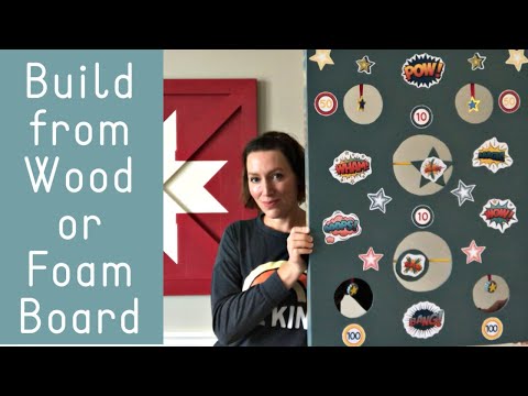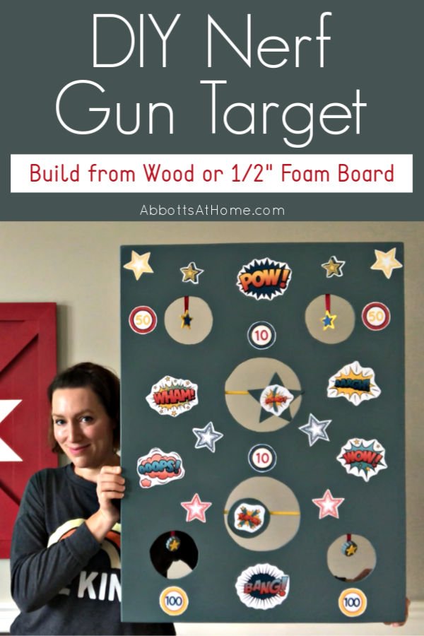 You can build this DIY Nerf Gun Target from Wood or 1/2″ Foam Board. It’s a great homemade kids game for indoors and outdoors play.