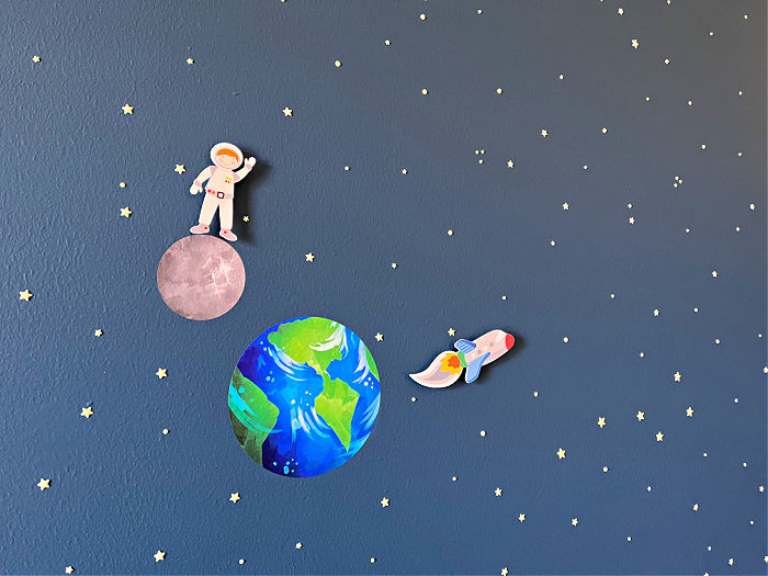I added the cute craft wood astronaut and rocket to add more detail and fun to this wall. You can find similar ones here.