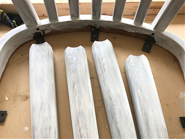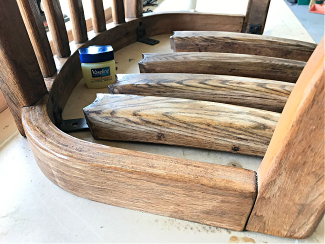 I applied wide lines of Vaseline on this chair because I wanted to expose a lot of the wood. Usually I just apply thin lines of Vaseline for a more subtle DIY White Distressed Chalk Paint Look.