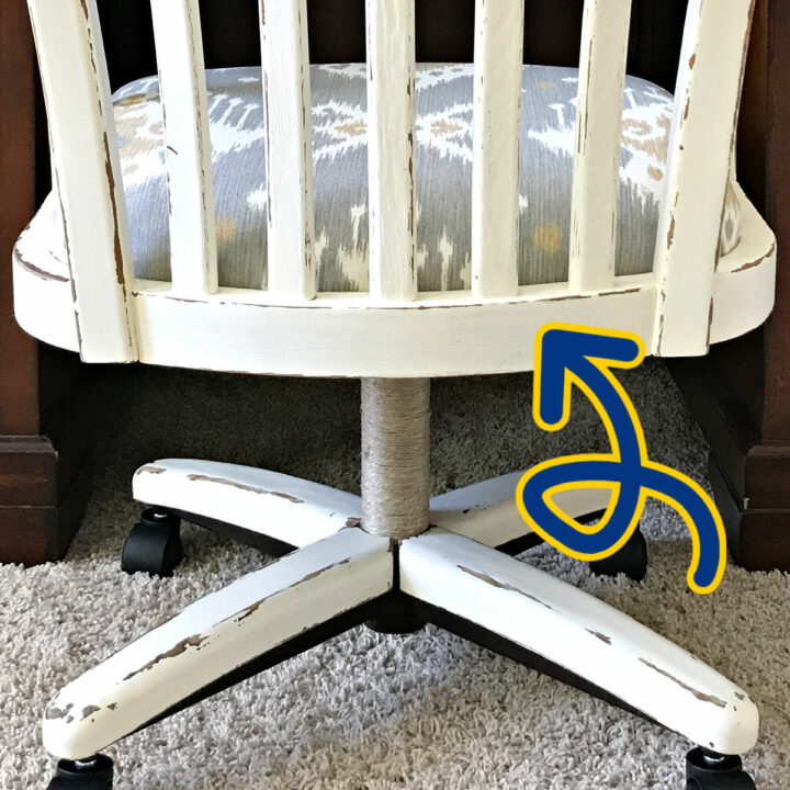 I wanted a shabby chic distressed paint look for this office chair. I thought that extra chippy white chalk paint over stain would look great with the fabric I picked out for the seat. Here’s how I got this look.