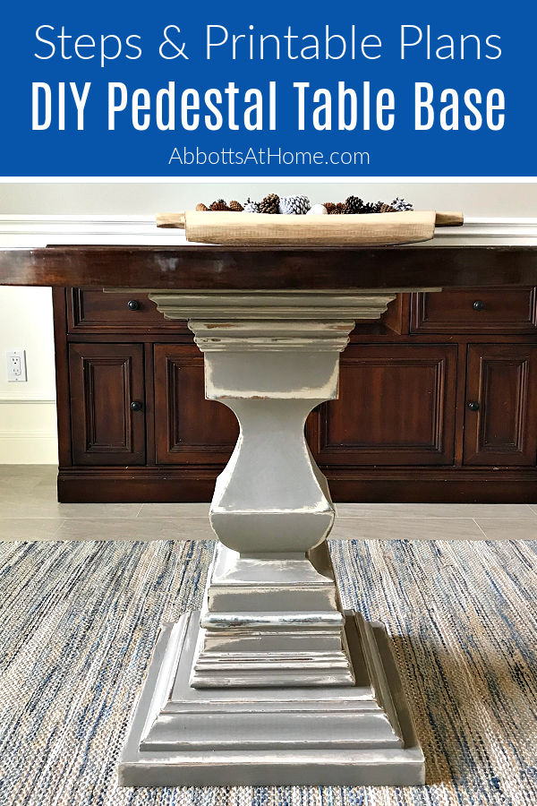 Easy to follow woodworking steps, video and printable plans for this beautiful DIY Wood Pedestal Table Base. Great for Round or Square Tops! Uses a premade pedestal center, adding lumber and molding to add width and height with just a Miter Saw. No bandsaw or lathe needed!