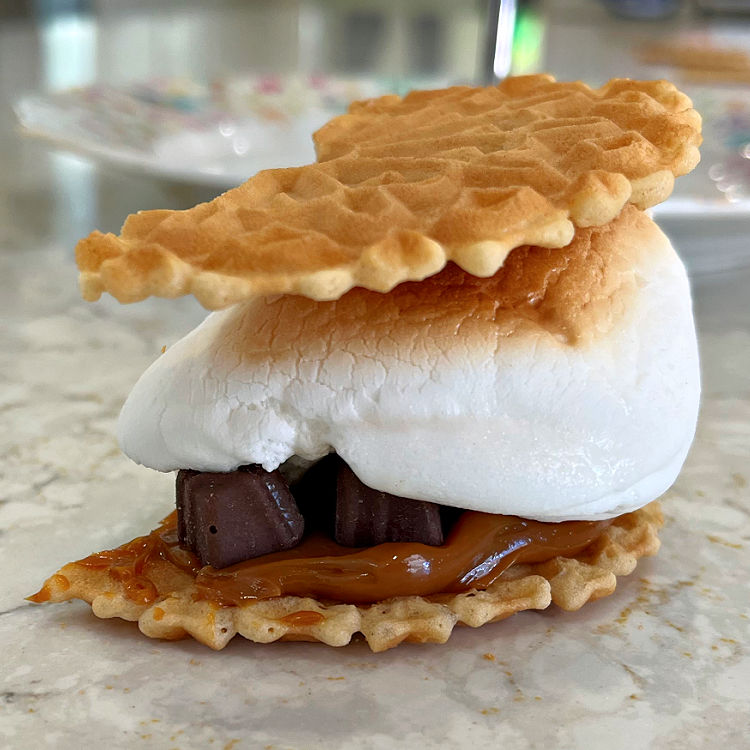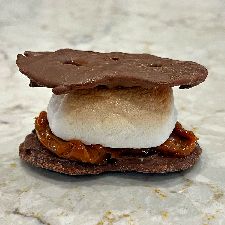 A Ghirardelli Chocolate Caramel Square is so tasty on a Smores with a Stroopwafel cookie too.