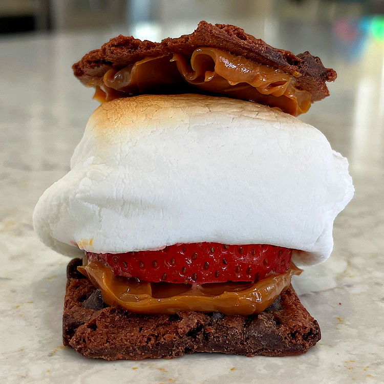 Use crunchy, yummy brownie brittle, Dulce De Leche, fresh strawberries and toasted marshmallow for this delicious Smores variation.