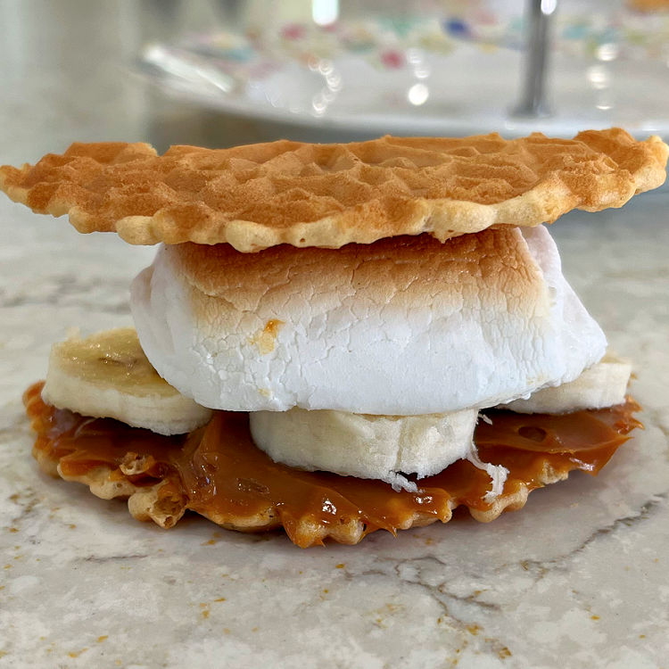 Spread a thick layer of gooey Dulce De Leche on a Stroopwafel and pop on a toasted marshmallow for this yummy Smores.